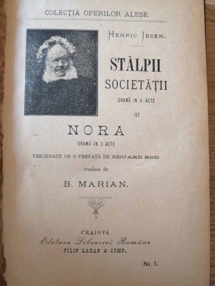 Henric Ibsen - Stâlpii societăţii si Nora. traduse de B. Marian. Craiova, 1895