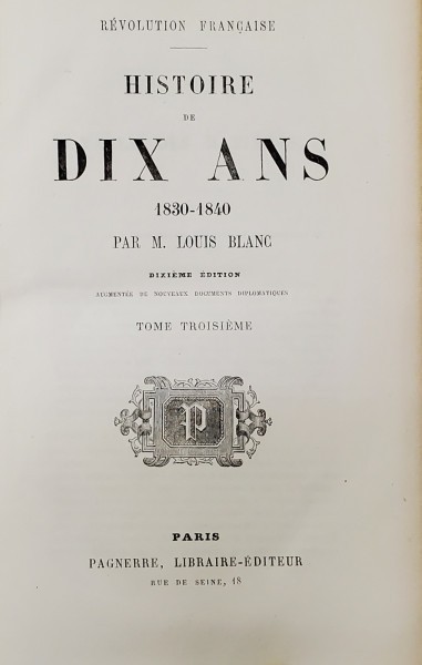 HISTOIRE DE DIX ANS 1830-1840 par M. LOUIS BLANC , TOME TROISIEME , 1851