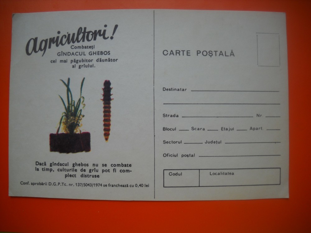HOPCT 448 T AGRICULTORI COMBATETI GANDACUL GHEBOS-CARTE POSTALA -BULETIN AVERTIZARE -MINISTERUL AGRICULTURII-NECIRCULATA