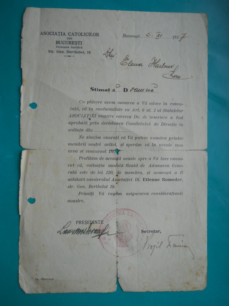 HOPCT DOCUMENT VECHI 262 ASOCIATIA CATOLICILOR DIN BUCURESTI 1937