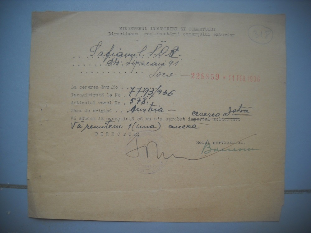 HOPCT DOCUMENT VECHI 318 MINISTERUL INDUSTRIEI COMERT EXTERIOR /BUCURESTI 1936