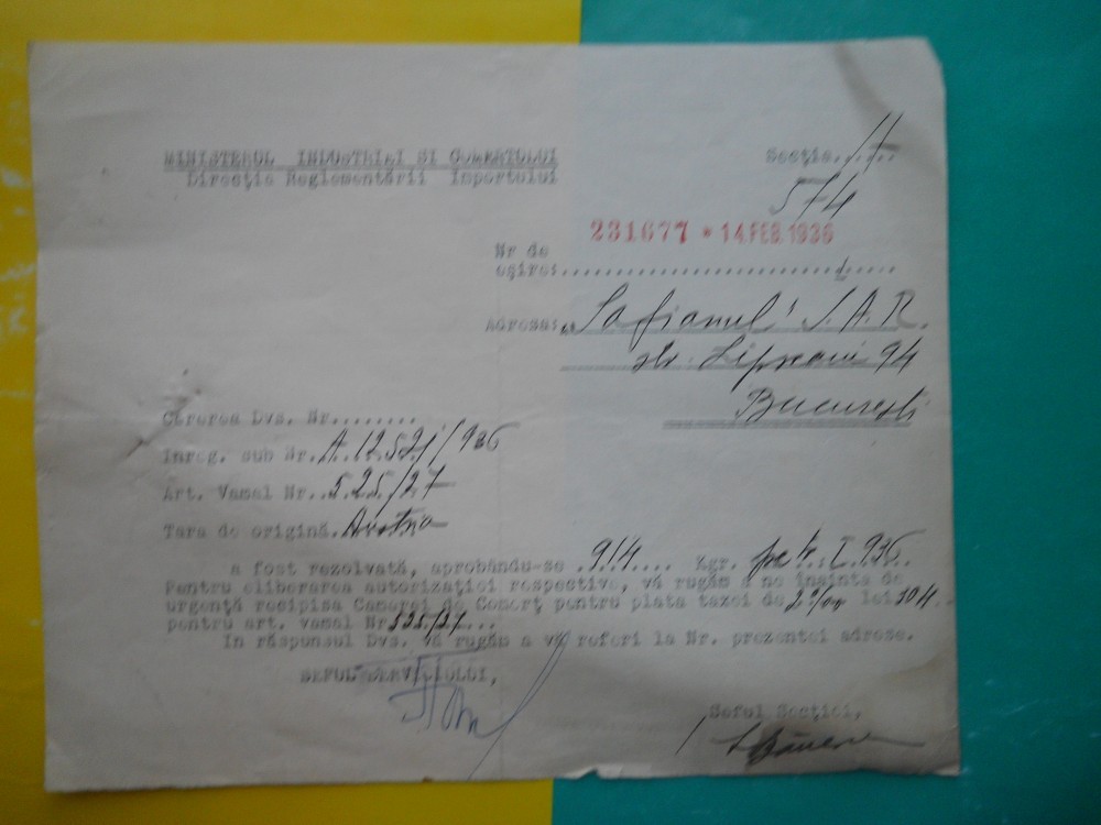 HOPCT DOCUMENT VECHI 32 - MINISTERUL INDUSTRIEI COMERT EXTERIOR /BUCURESTI 1936