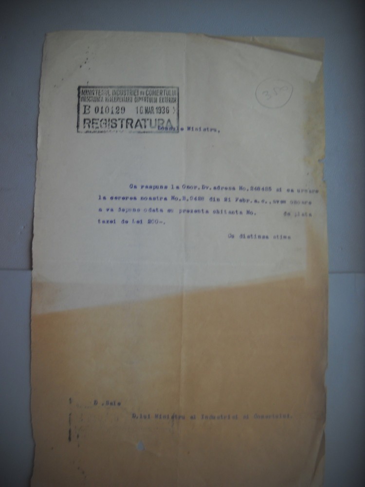 HOPCT DOCUMENT VECHI 351 MINISTERUL INDUSTRIEI COMERT EXTERIOR /BUCURESTI 1936