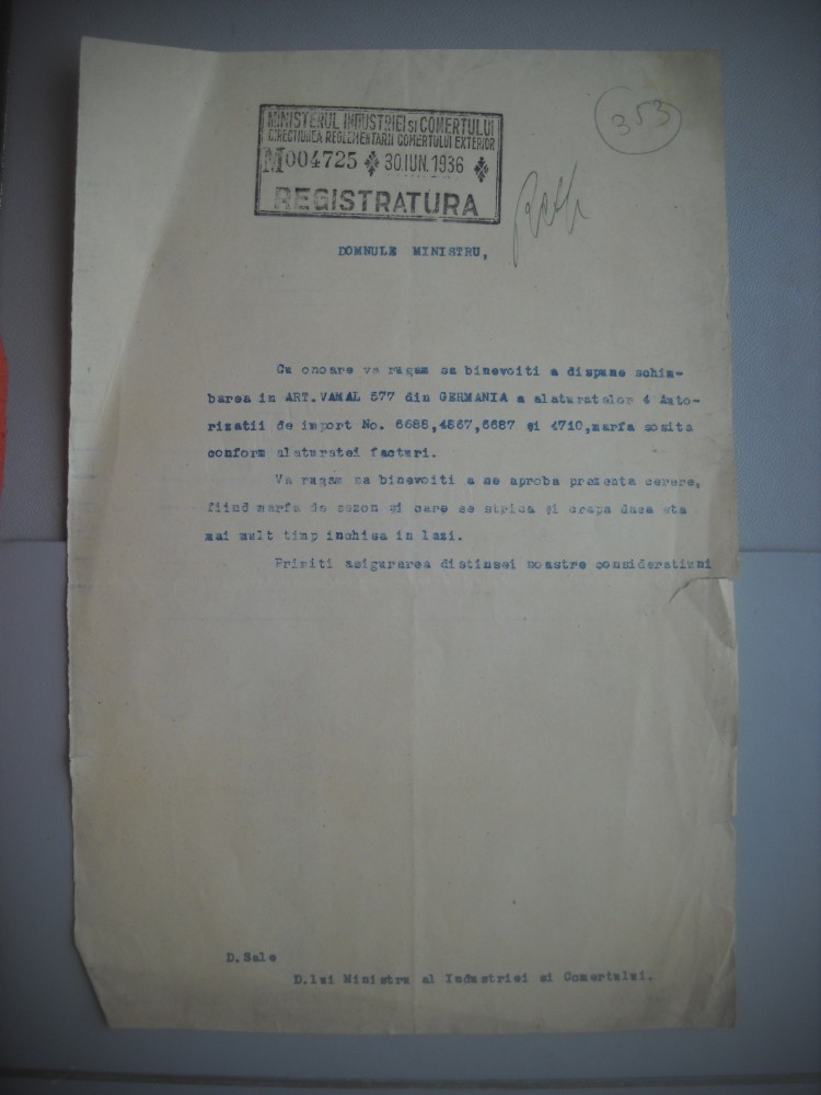 HOPCT DOCUMENT VECHI 353 MINISTERUL INDUSTRIEI COMERT EXTERIOR /BUCURESTI 1936