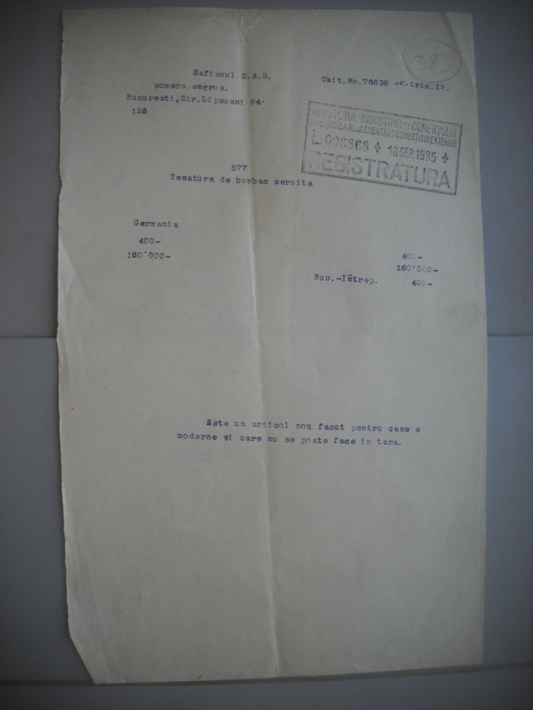 HOPCT DOCUMENT VECHI 383 MINISTERUL INDUSTRIEI COMERT EXTERIOR /BUCURESTI 1935