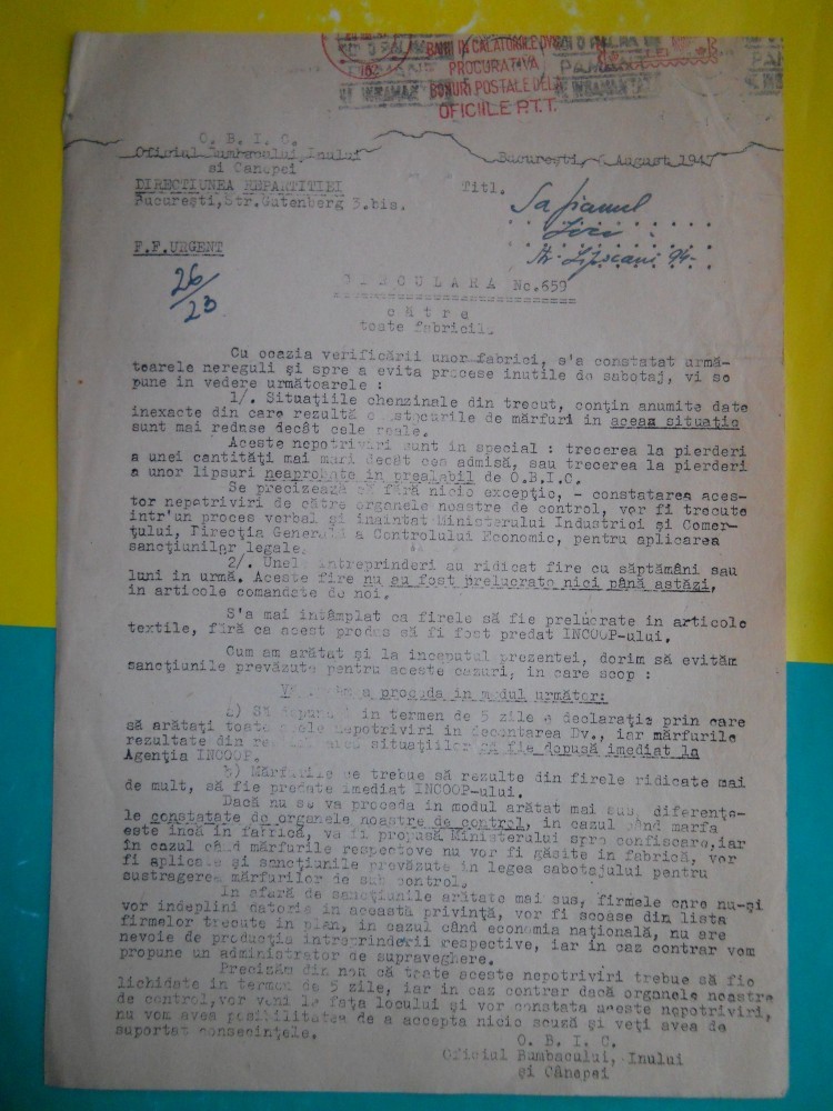 HOPCT DOCUMENT VECHI 4 -OFICIUL BUMBACULUI ,INULUI SI CANEPEI BUCURESTI 1947