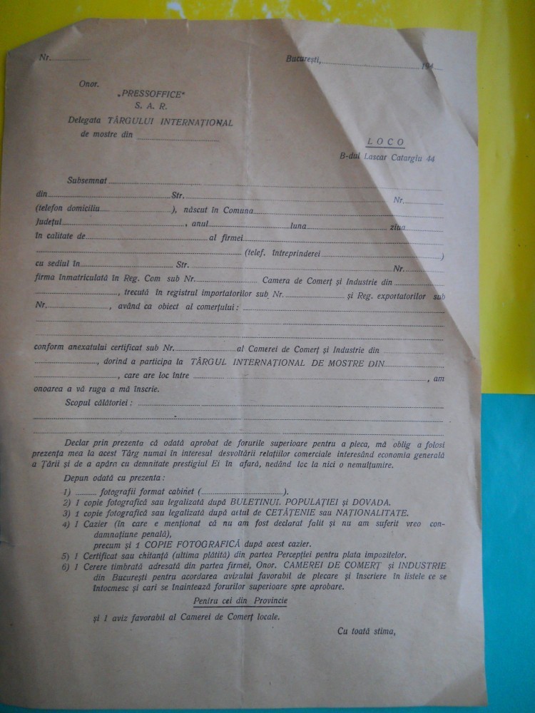 HOPCT DOCUMENT VECHI 40 -PRESSOFICE SAR TIRGUL INTERNAT.MONSTRE/BUCURESTI 194...