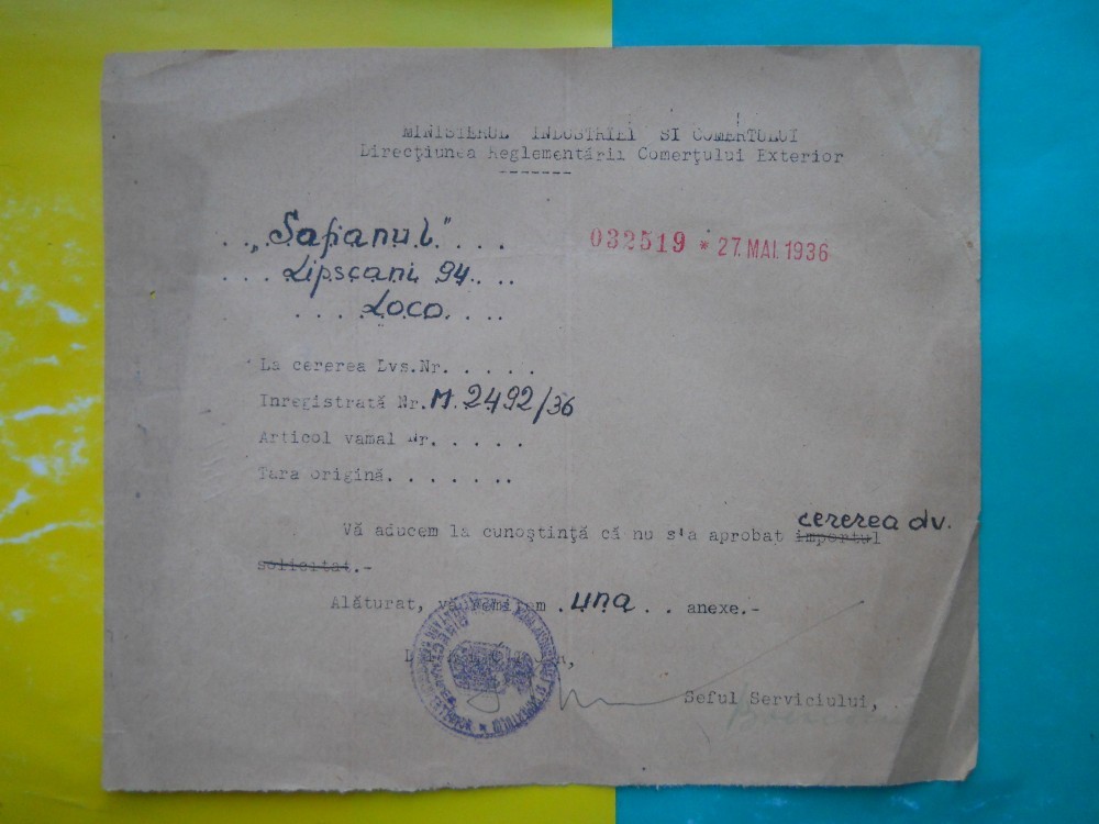 HOPCT DOCUMENT VECHI 46- MINISTERUL INDUSTRIEI COMERT EXTERIOR /BUCURESTI 1936