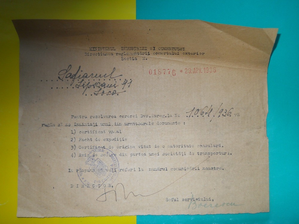 HOPCT DOCUMENT VECHI 57 - MINISTERUL INDUSTRIEI COMERT EXTERIOR /BUCURESTI 1936
