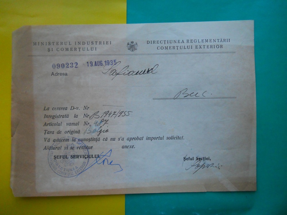 HOPCT DOCUMENT VECHI 68 - MINISTERUL INDUSTRIEI COMERT EXTERIOR /BUCURESTI 1935