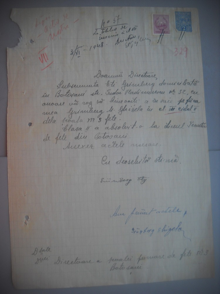 HOPCT DOCUMENT VECHI NR 479 GRIMBERG GHIZE-EVREU -SCOALA NR 3 FETE BOTOSANI 1948