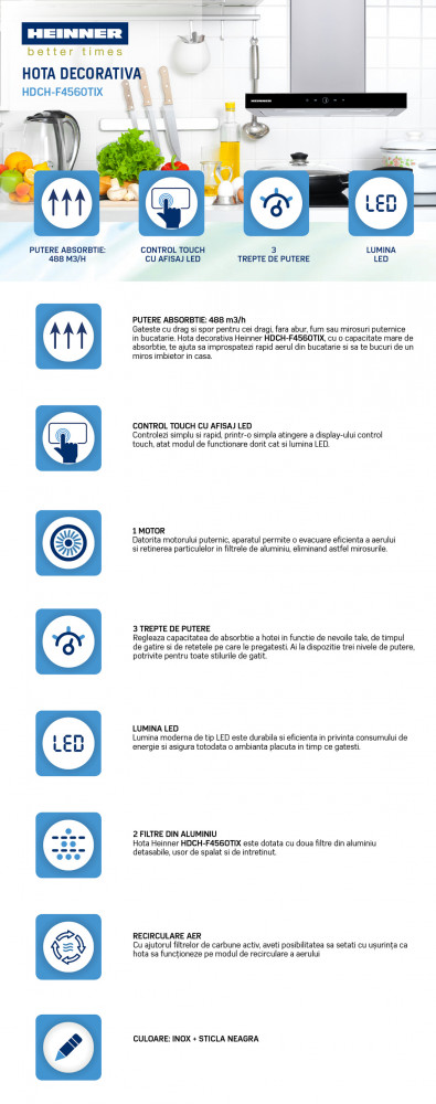 Hota decorativa Heinner, 488 m3/h, incorporabila, 59.5 x