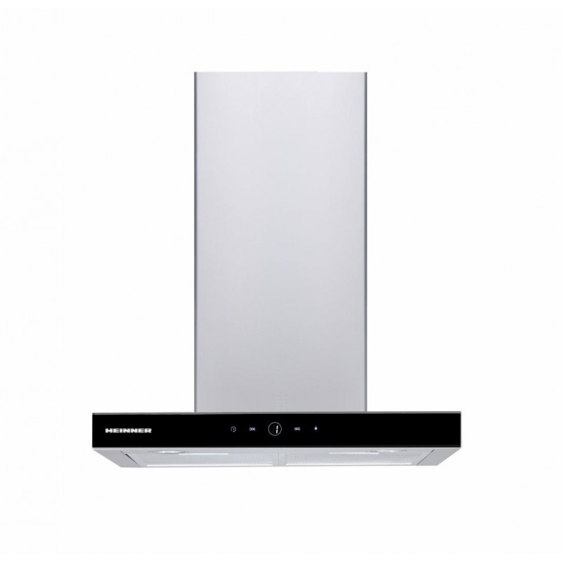 Hota decorativa Heinner, 488 m3/h, incorporabila, 59.5 x 34.6 x 50 cm, 2 filtre, 3 viteze, lumina LED, 2 x 1.5 W, inox/sticla, Argintiu/Negru