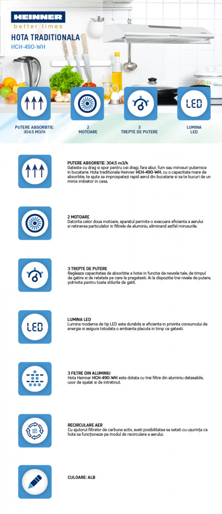 Hota traditionala Heinner, 2 x 60 W, 90 cm, 304.5 m3/h, 3 trepte viteza, Alb
