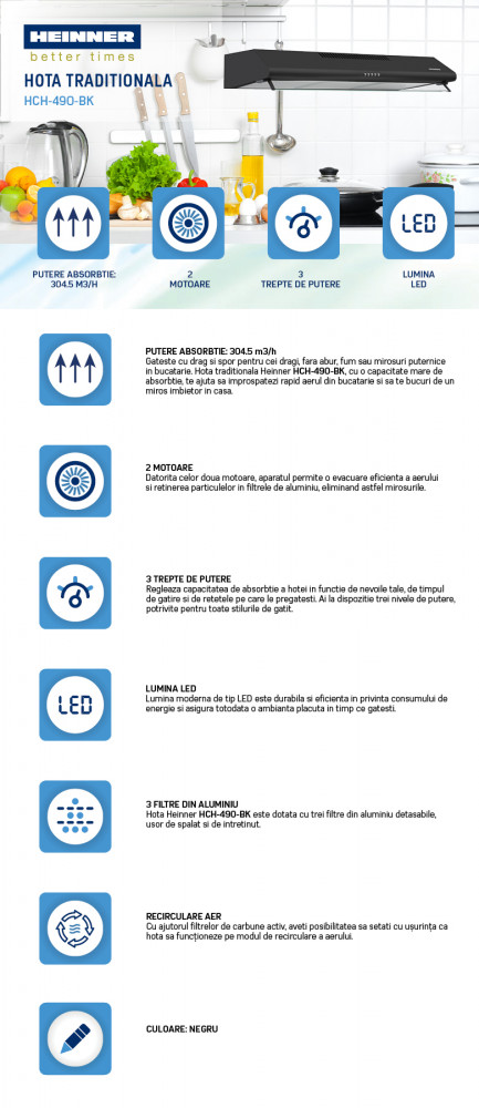 Hota traditionala Heinner, 2 x 60 W, 90 cm, 304.5 m3/h, 3 trepte viteza, Negru