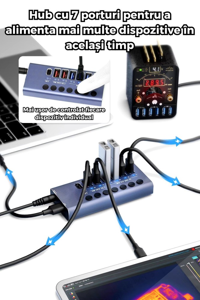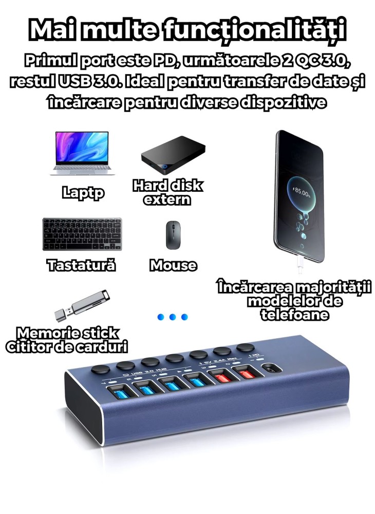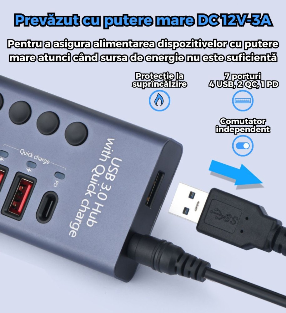 Hub USB 7 in 1 cu Buton ON/OFF, PRESTIGE CHARGE®, din Aluminiu, 4 Porturi USB 3.0 Transfer Date 5Gbps si TypeC PD + 2*USB Incarcare QC 3.0, Incarcator