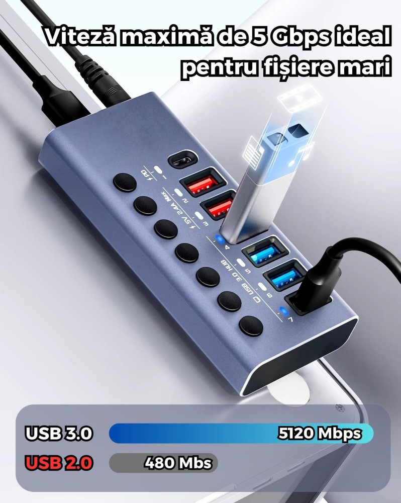 Fabricat dintr-un aliaj de aluminiu rezistent, acest hub combina eleganta cu durabilitatea. Designul sau compact si butonul ON/OFF va permit sa controlati alimentarea fiecarui port, fara sa deconectati fizic dispozitivele, protejand astfel durata de viata a acestora si economisind energie.