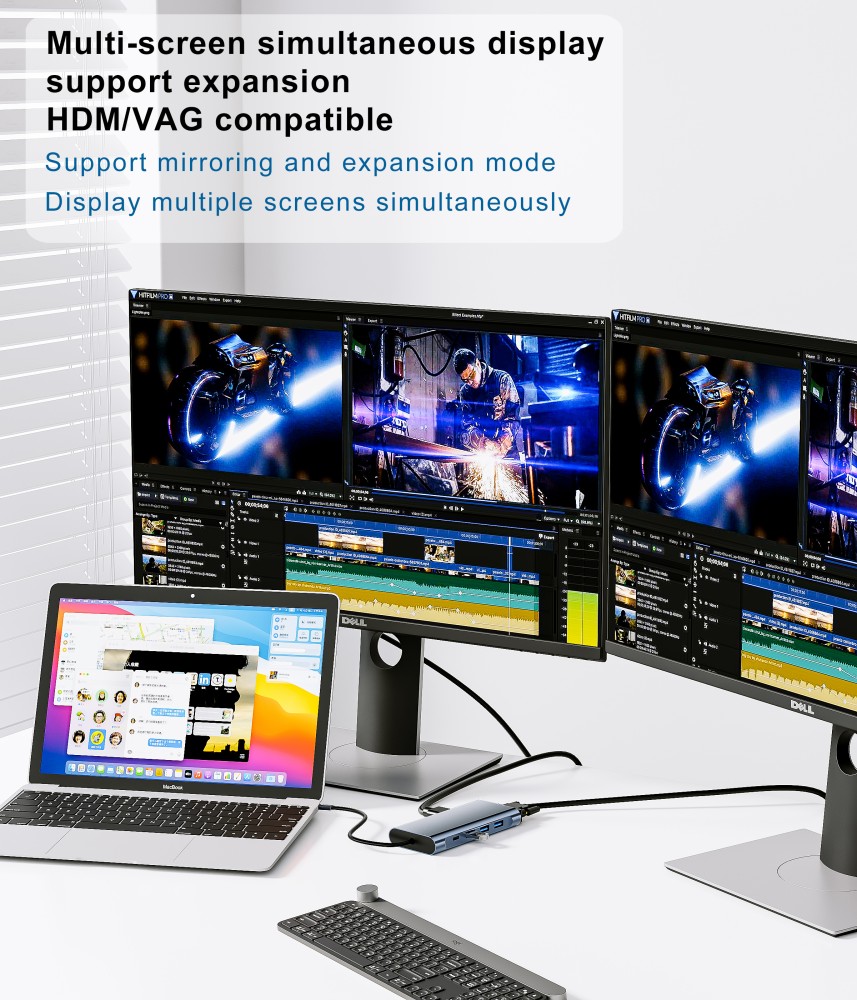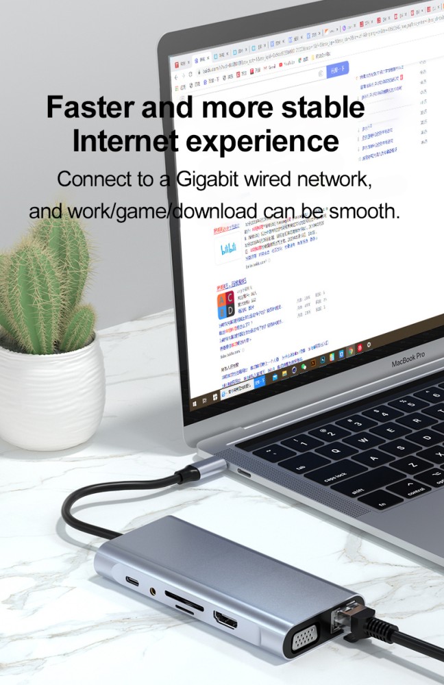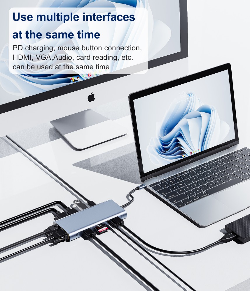 Acest HUB multifunctional iti transforma portul USB-C intr-un total de 11 porturi diverse, inclusiv: