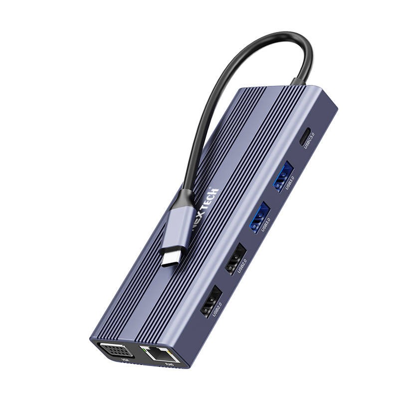 Hub USB NEX 12 in 1 NEX TECH? USB-C 4K HDMI, 1000Mbps, USB 3.0, SD, USB 2.0, RJ45, Adaptor Multiport, Incarcare PD 100W, 5 Gbps, VGA, Aluminiu, Card R