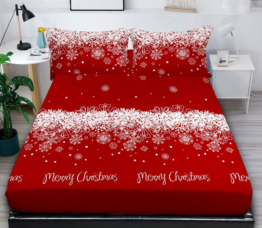 Husa De Pat De Craciun Weihnachten Cr040, Bumbac, 3 Piese, Cu Elastic, Rosu