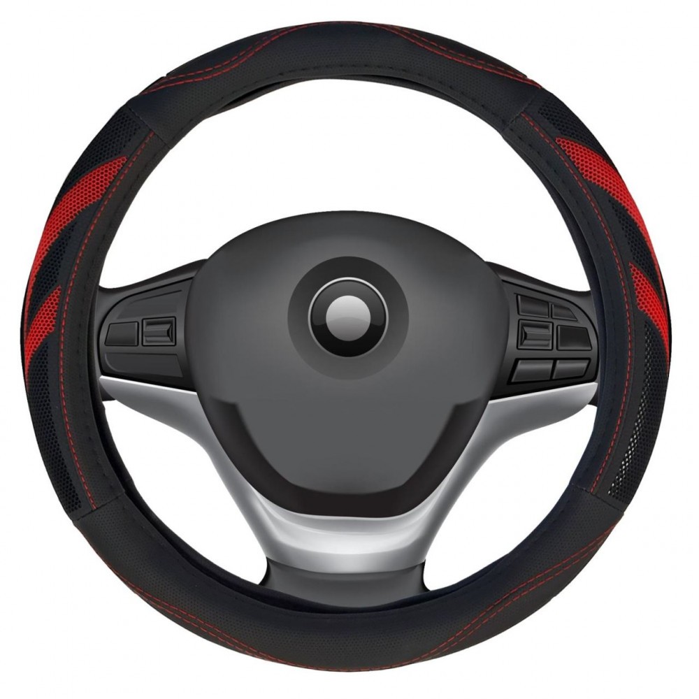 Husa volan din piele ecologica Siegbert, microperforatii, neagra cu ornamente rosii Automobile ProTravel