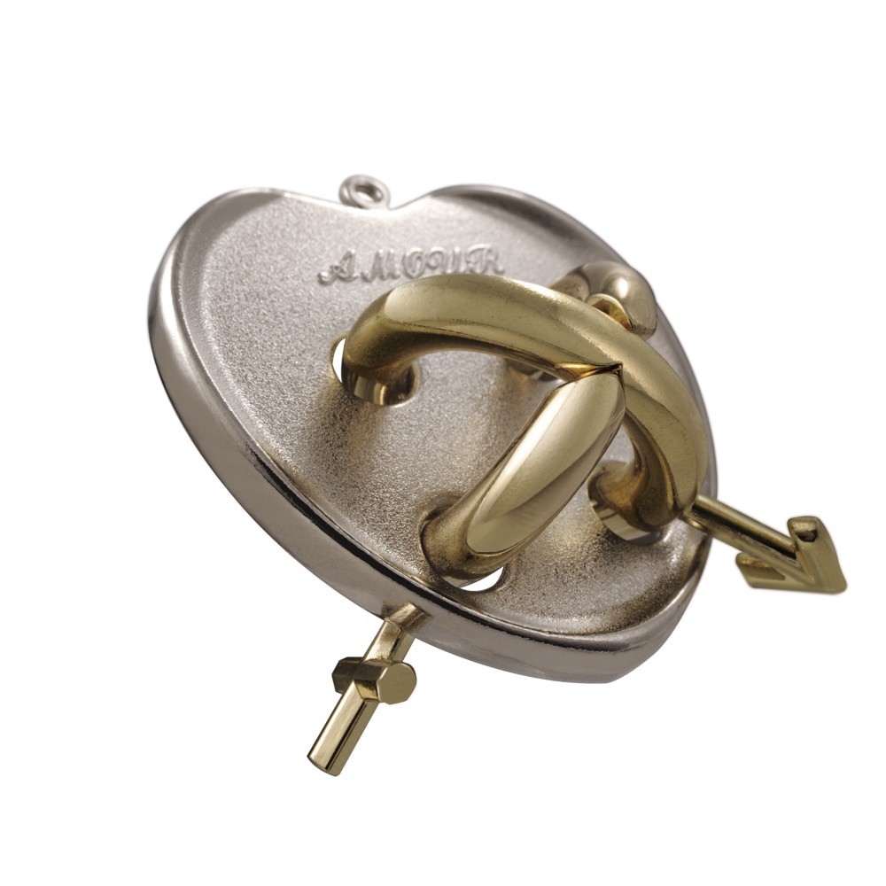 Huzzle Cast AMOUR este o capodopera al fierarului din metal Akio Yamamoto(1991), iar cuvantul cheie pentru acest puzzle este "IUBIRE". Cele doua bucle legate, fac din acest puzzle o provocare extrema. Obiectivul este de a separa buclele legate de un "fir extrem de puternic", denumita dupa relatia lui "Adam" si "Eva", de pe placa metalica realizata sub forma "Fructelor interzise". In cazul in care ati reusit dezansamblarea lor, va trebui sa le reansamblati la forma lor initiala, fiindca iubirea trebui sa infloreasca din nou. Material: Alianj Zinc 99% + placare. Varsta recomandata: 8+ ani. Dimensiuni set: 7.5 x 11.9 x 4.5 cm.