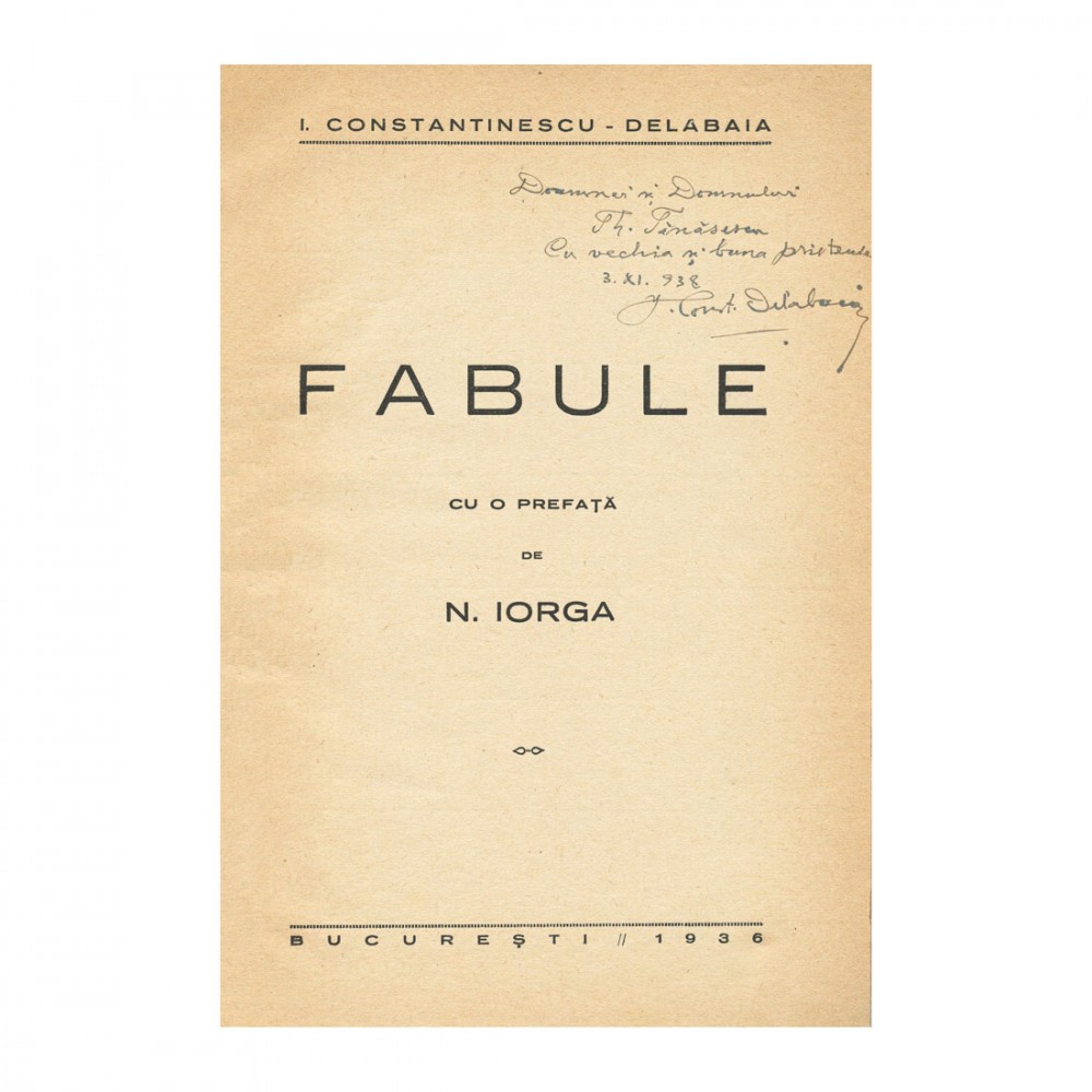 I. Constantinescu-Delabaia, Fabule, București, Tipografia „Lupta”, 1936, 164 p., cu o prefață de N. Iorga. Volumul conține dedicația olografă a autorului către familia inginerului Tănăsescu datată 1938. Legătură contemporană, integral din piele, în interior se păstrează coperta originală.