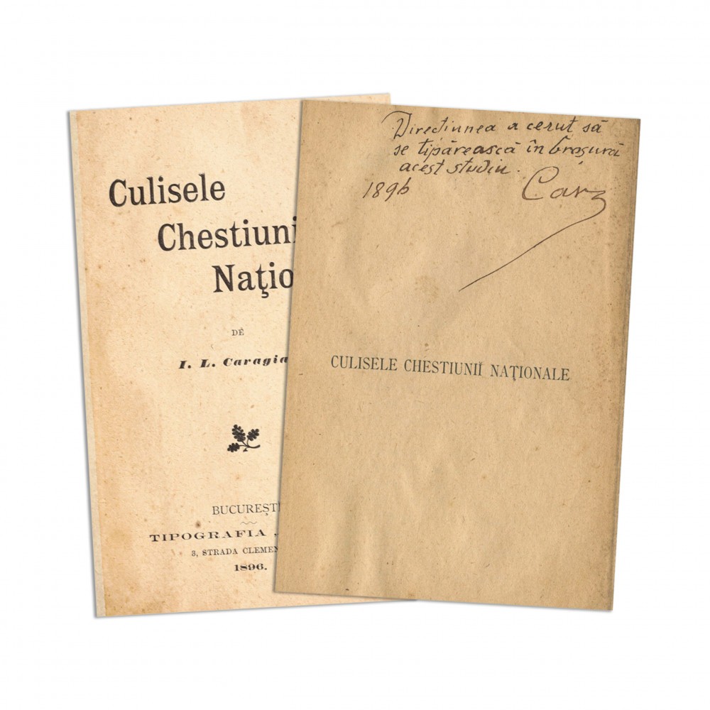 I. L. Caragiale, Culisele Chestiunii Naționale, București, Tipografia „Epoca”, 1896, 54 p. Volumul poartă însemnarea olografă a lui I. L. Caragiale: „Direcțiunea a cerut să tipărească în broșură acest studiu”, datată 1896 și semnată olograf la final. Prezența autografului lui Caragiale face ca această piesă să fie una extrem de rară. Legătură contemporană integral din piele.