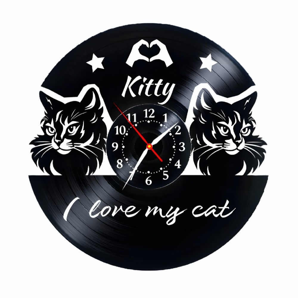 Realizat manual dintr-un disc de vinil, acest ceas aduce un strop de farmec vintage în casa ta, iar mesajul "I LOVE MY CAT" îți va aduce mereu zâmbetul pe buze. Perfect pentru a adăuga un strop de personalitate și pasiune pentru feline în decorul tău.