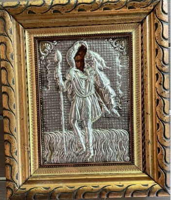Icoană interbelică . Sfântul Cristofor, alpaca, 28 x 24 cm, rama dubla, sticlă, stare buna, ortodoxie, credinta