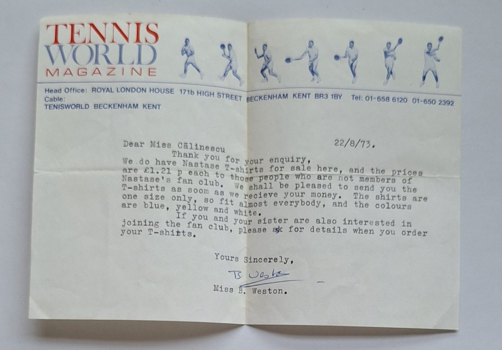 Ilie Năstase 1973 – scrisoare Tennis World Magazine despre tricouri & fan club