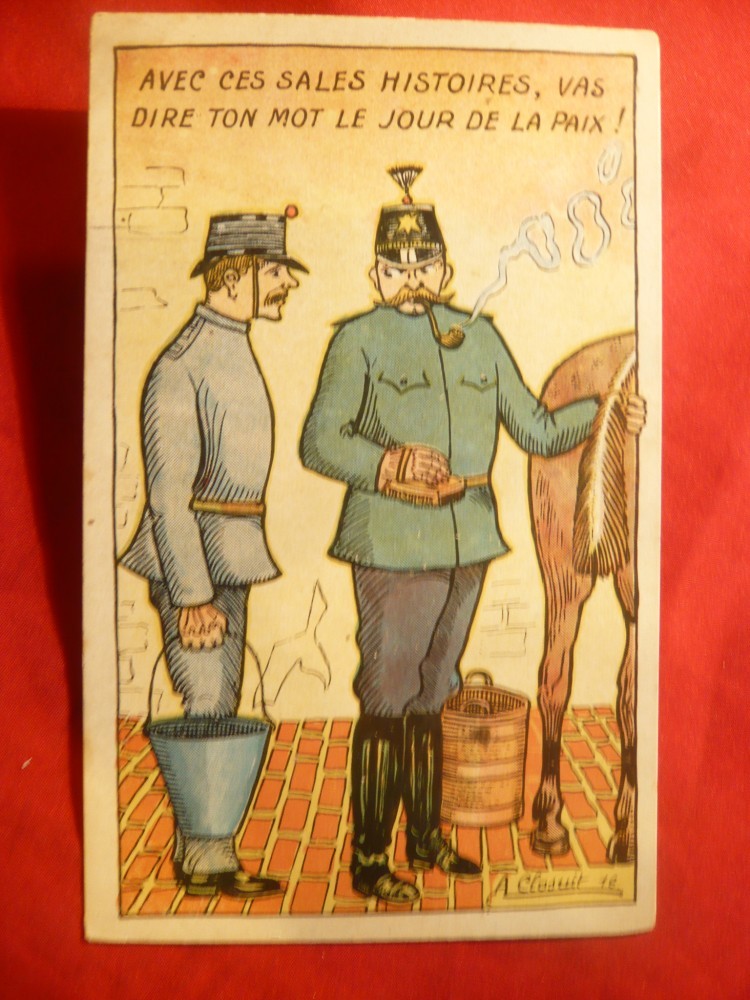 Ilustrata comica militara - Soldati si cal ,semnat A.Closuit 1918