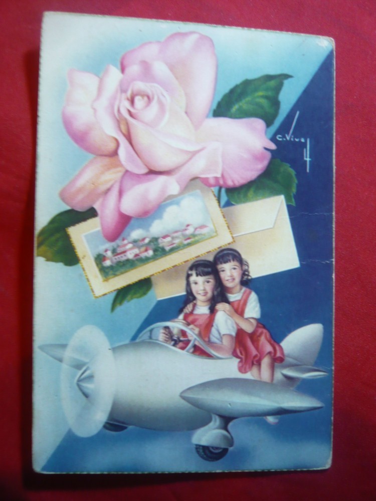 Ilustrata - Felicitare - Fetite in avion -Spania , semnata C.Vinet