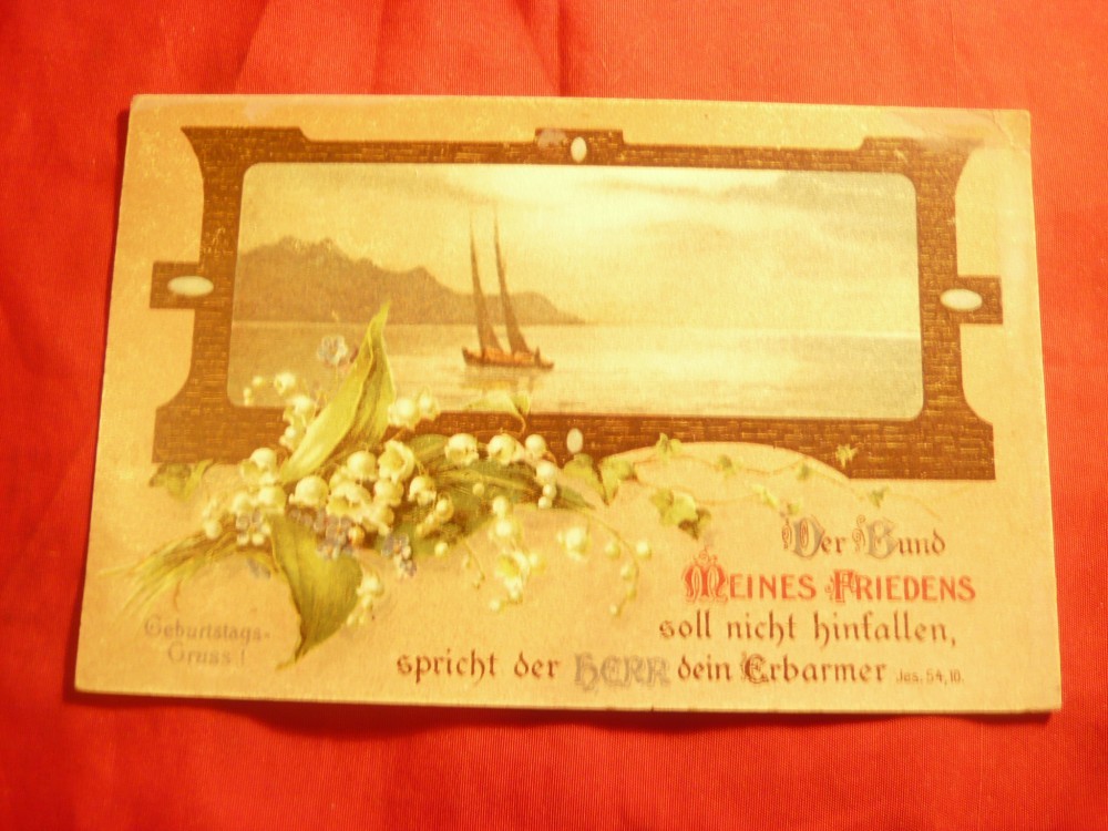 Ilustrata- Felicitare - Peisaj cu barca circ. 1928 ,francat cu straif 3x1 leu Mi