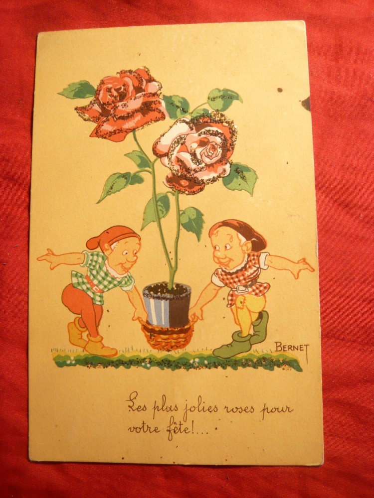 Ilustrata- Felicitare- Pitici cu Trandafiri , semnat Bernet