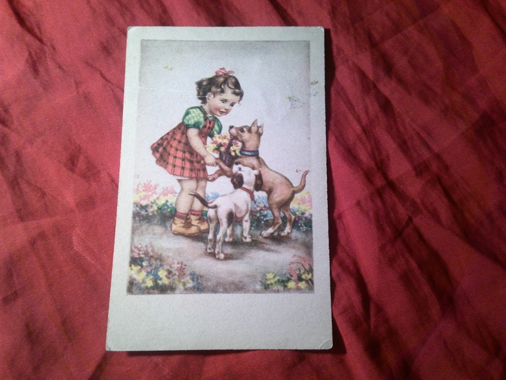 Ilustrata - Felicitare Romania 1945 circulata Turda-Cluj - Fetita , Flori , Caini