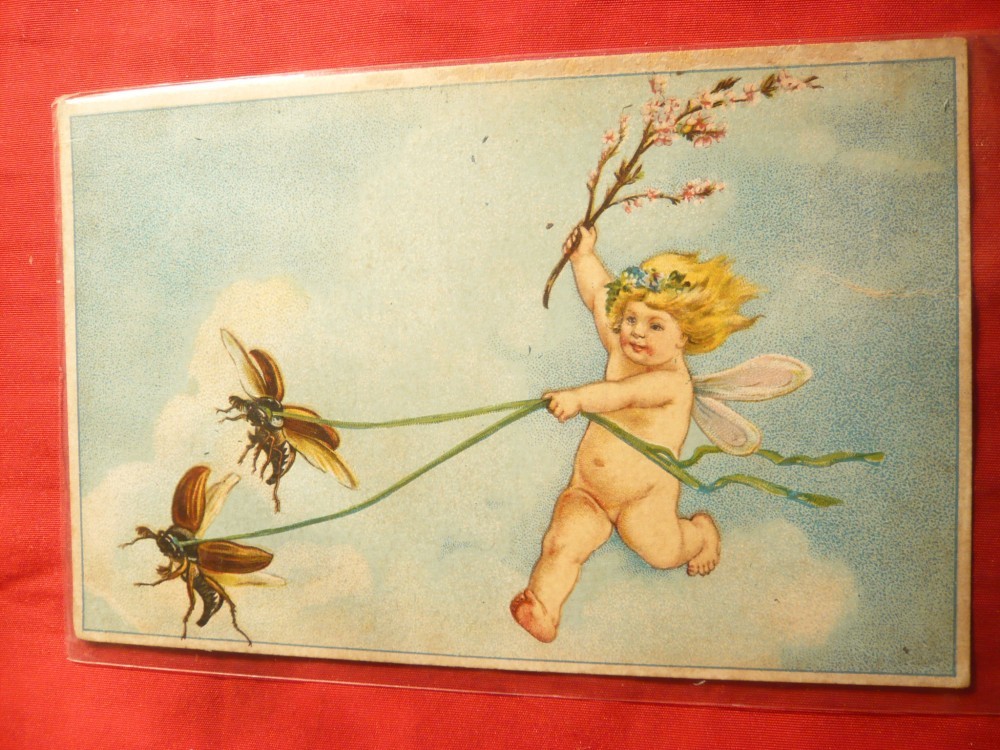 Ilustrata - Ingeras in zbor cu carabusi , interbelica