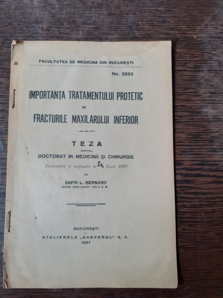IMPORTANTA TRATAMENTULUI PROTETIC IN FRACTURILE MAXILARULUI INFERIOR, 1927 - SAFIR L. BERNARD (TEZA DOCTORAT)