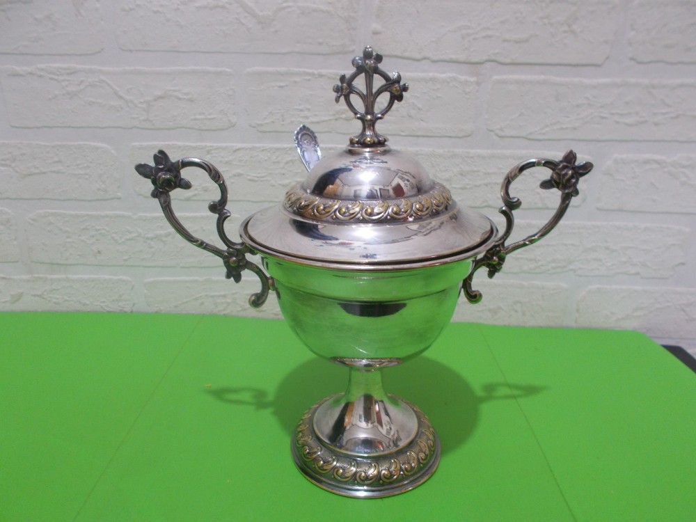 Este o piesa rara,de colectie, foarte frumoasa, ce dateaza din perioada interbelica, anii 1920. Este din alama argintata si este marcata pe picior cu sigla CGH (foto). Are forma de cupa cu picior si are un capac rotund cu o degajare pentru lingurita. Talpa si capacul au cate o bordura decorata in relief in teme geometrice, specifice perioadei. Cele doua anse si manerul capacului sunt decorate cu flori. Lingurita este din alpaca argintata si pe spatele manerului are marcajul GAB. Poarta patina vechimii de cca 100 de ani si este in stare buna. Se poate folosi pentru servirea caviarului, sosurilor, ca zaharnita, etc. sau ornamental.