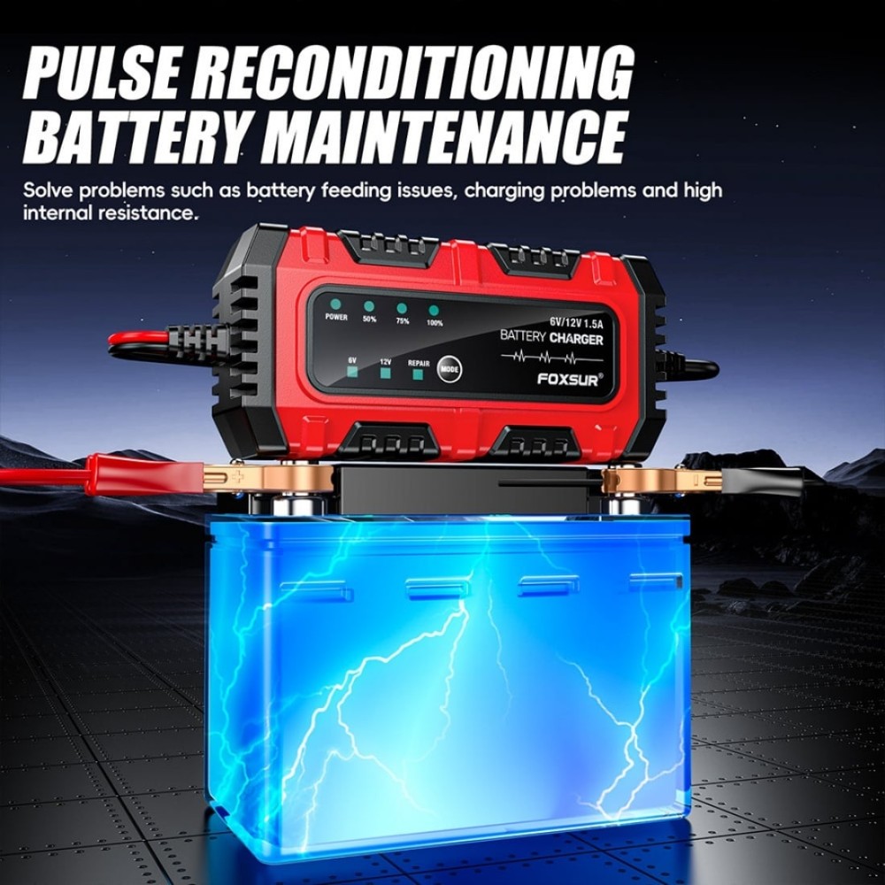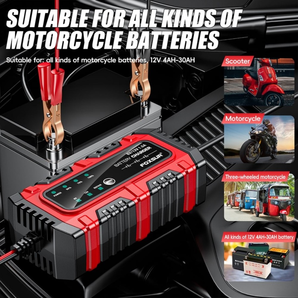 FOXSUR FBC061215E este un incarcator automat si inteligent pentru baterii de 6V si 12V, proiectat pentru incarcarea si intretinerea eficienta a bateriilor de masina, motocicleta, scuter sau vehicule electrice pentru copii. Potrivit pentru baterii de la 4Ah pana la 30Ah, ofera incarcare sigura, stabila si controlata microprocesor.