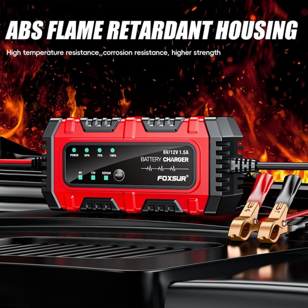 FOXSUR Incarcator Inteligent Baterii Auto 6V/12V 1.5A – Compatibil cu baterii AGM, GEL, LiFePO4, EFB, Plumb-Acid