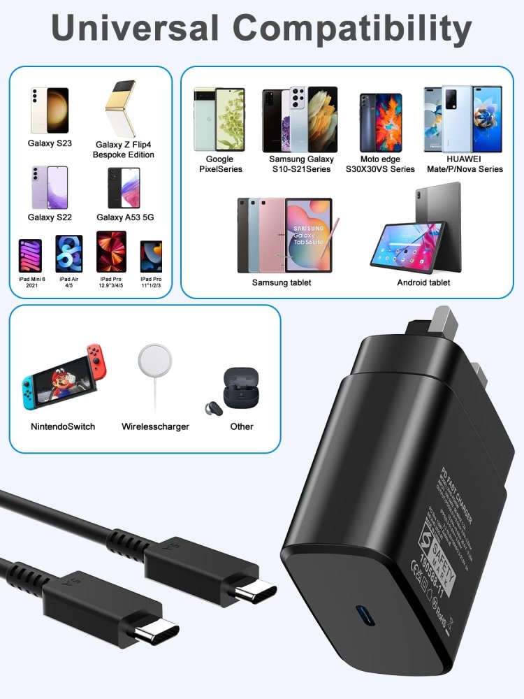 - Design compact: Cu un design compact, ușor de transportat și confortabil de ținut, incărcătorul rapid Samsung iți permite să incarci acasă, in timp ce călătorești, la birou și in călătorii de afaceri. Cablul lung convenabil este testat pentru a rezista la peste 25.000 de cicluri de indoire la 95° și puteți utiliza, de asemenea, cablul incărcătorului USB C pentru a sincroniza și transfera fișiere cu Galaxy sau orice alt smartphone și laptop compatibil la viteze uimitoare.