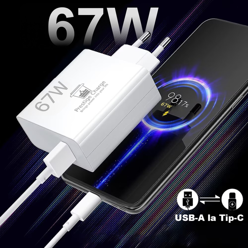 Incarcator TurboCharge 67W, PRESTIGE CHARGE®, pentru Xiaomi, RedMi, inclus cablu 6A, USB la USB-C, transfer date si incarcare, 2m