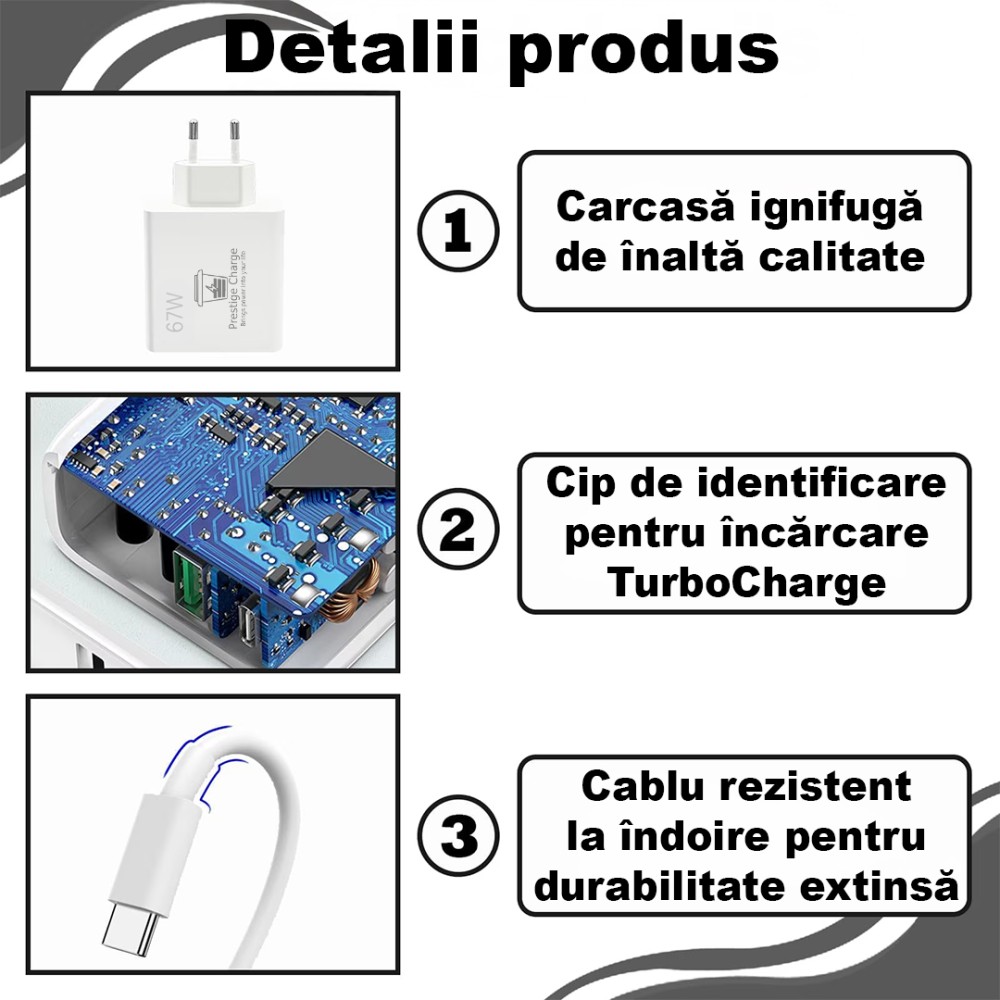 Continut pachet:1 incarcator cu incarcare turbocharge 67w