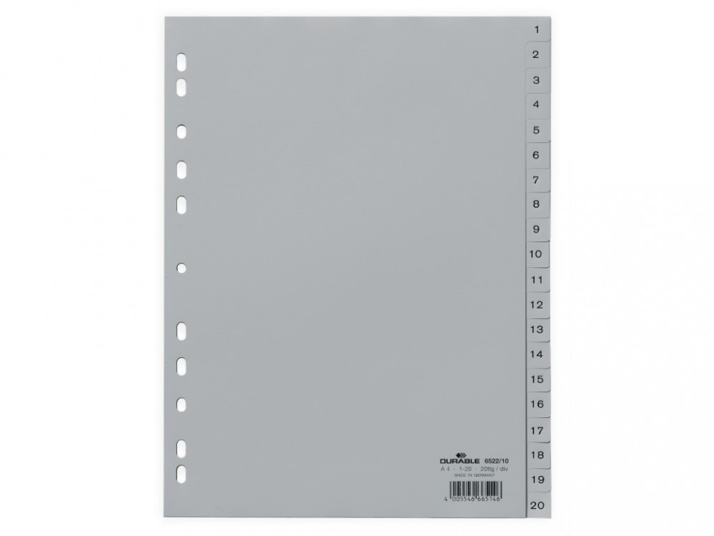 Index polipropilena, cu file tiparite numeric (1-20), pentru divizare facila. Format: portret, A4, 297 x 215/230 Numar de divizari : 20 Perforatii universale