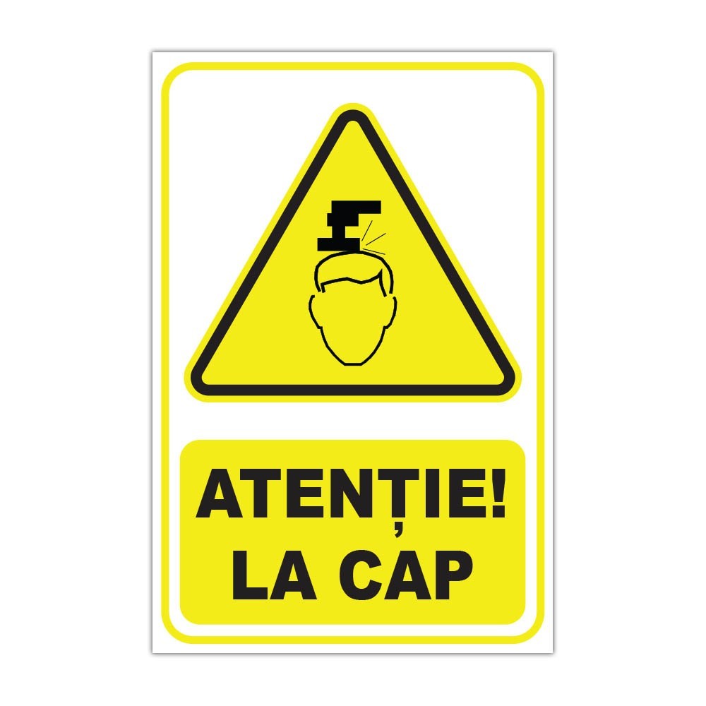 Indicator de avertizare „Atenție! La cap”, ideal pentru semnalizarea zonelor cu risc de lovire la cap în spații industriale, comerciale sau tehnice. Disponibil pe autocolant printat UV sau pe plastic PVC 3 mm, în mai multe dimensiuni.
