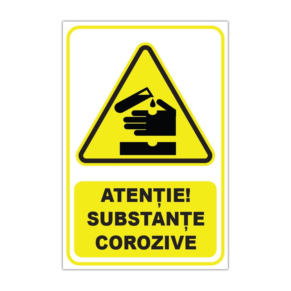 Indicator de avertizare „Atenție! Substanțe corozive”, potrivit pentru spații industriale, depozite, laboratoare sau zone unde se manipulează substanțe periculoase. Disponibil ca autocolant printat UV sau placă din plastic PVC 3 mm.