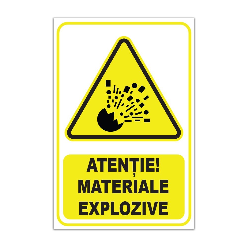 Indicator de avertizare „Atenție! Materiale explozive”, ideal pentru semnalizarea clară a zonelor și spațiilor unde există risc asociat materialelor explozive. Disponibil pe autocolant printat UV sau pe plastic PVC 3 mm, în mai multe dimensiuni.