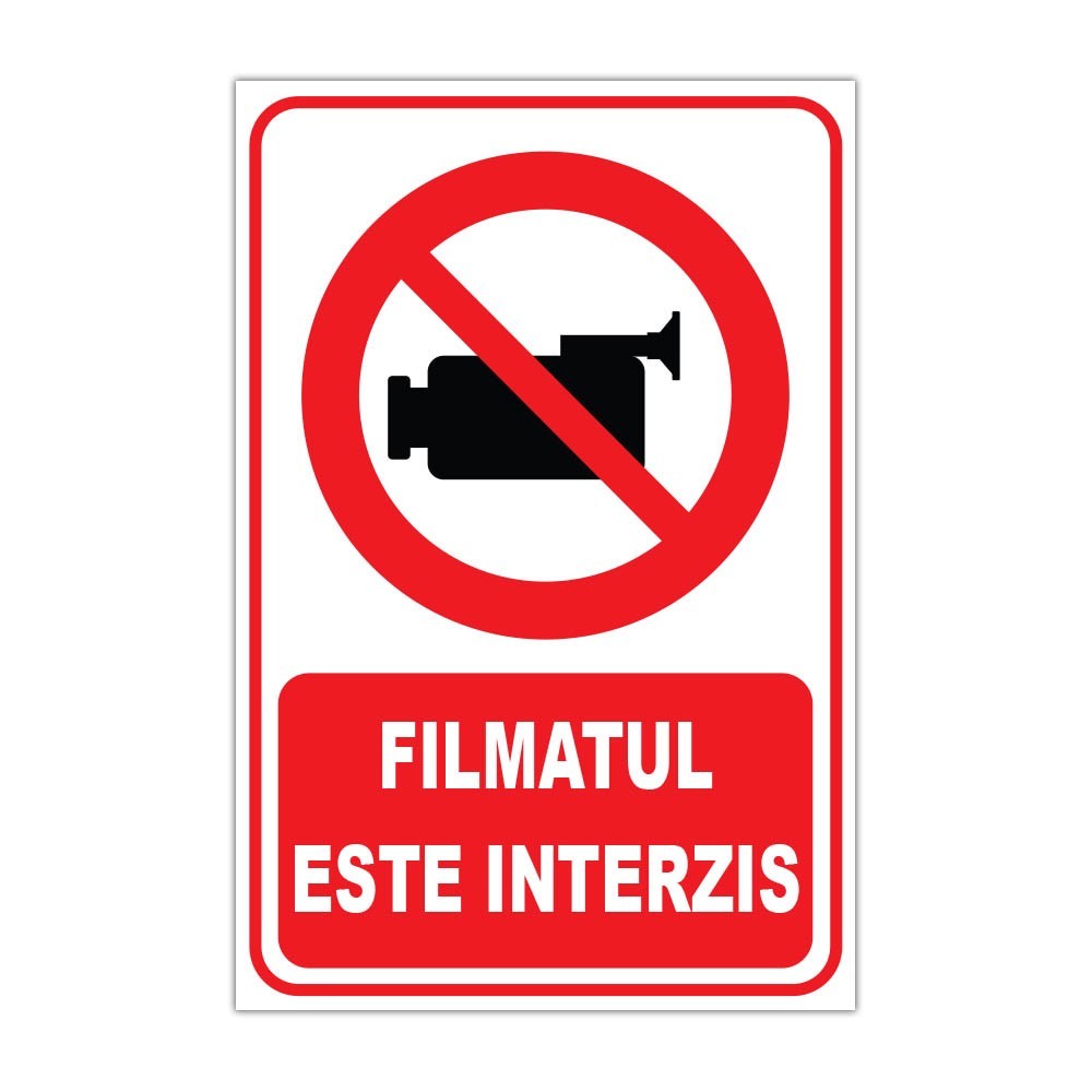 Indicator de interzicere „Filmatul este interzis”, ideal pentru spații comerciale, birouri, instituții sau zone cu acces controlat. Disponibil ca autocolant printat UV sau pe suport rigid din Plastic PVC 3 mm.