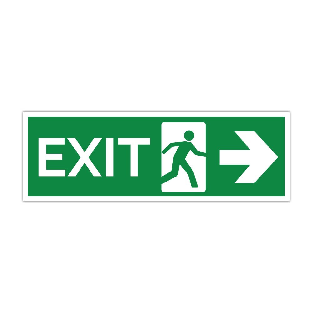 Indicator de evacuare cu text EXIT, pictogramă de ieșire și săgeată orientată spre dreapta, ideal pentru marcarea clară a traseelor de evacuare în spații comerciale, birouri, hale, instituții sau clădiri publice.